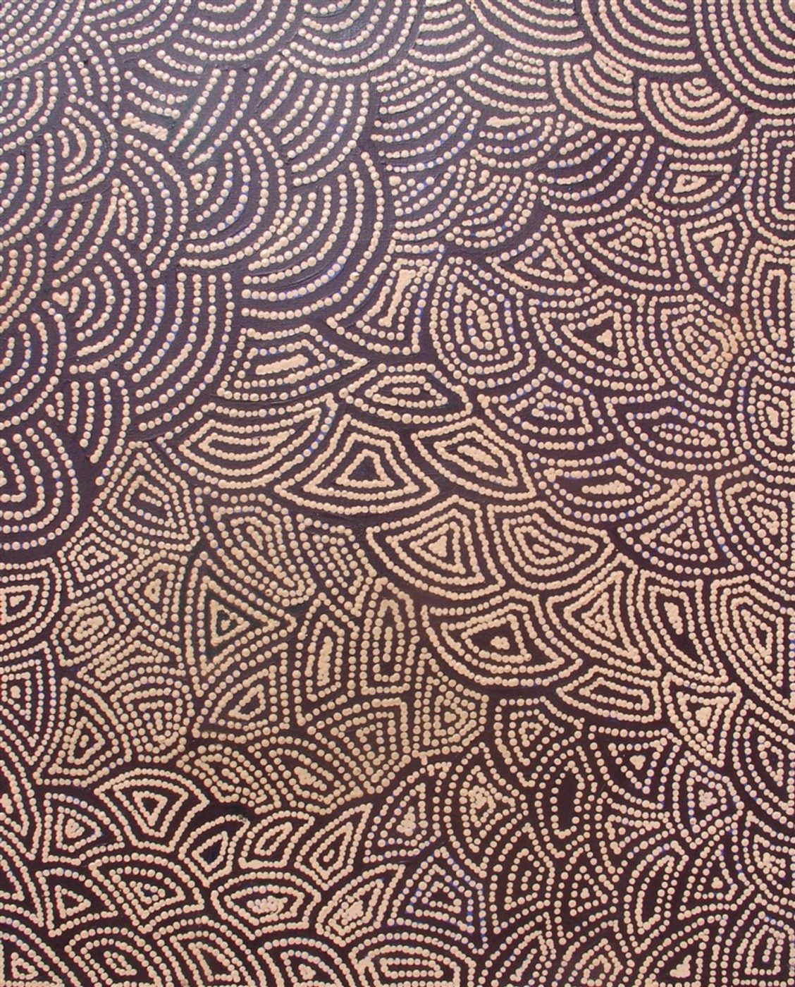 The site for this Dreaming is Yumari, a collection of rocks west of Kintore in the Gibson Desert. Yumari is the site of a forbidden love union between a Japaljarri man and a Nangala woman. This Dreaming was passed down to the artist by a Pintupi man. In contemporary Warlpiri paintings traditional iconography is used to represent the Jukurrpa, associated sites and other elements. In this work concentric circles are often used to represent ‘warnirri’ (rock holes).