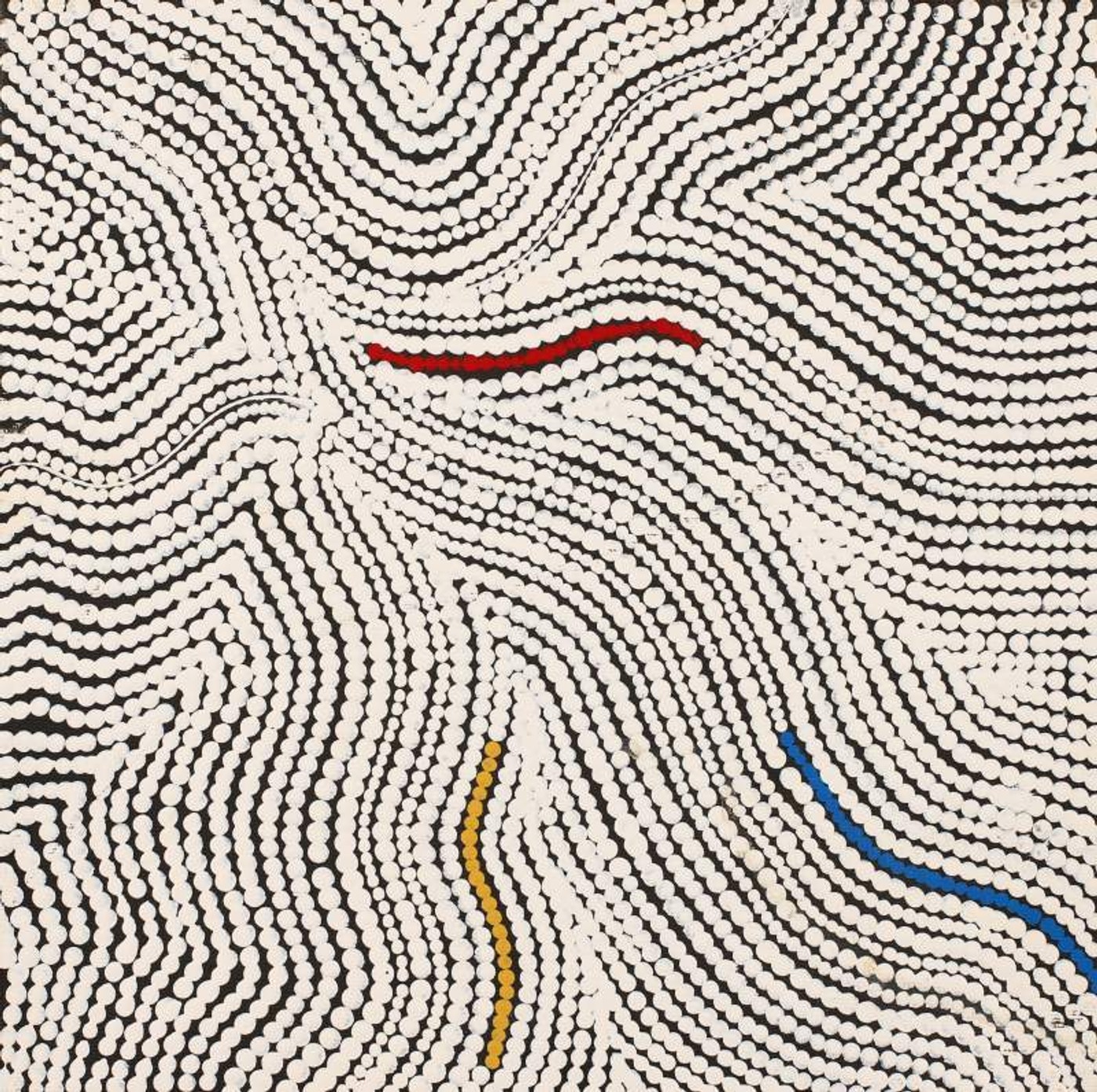 This painting depicts Nakamarra and Napurrurla women hunting for bush foods. The ‘kirda’ (owners) for this story are Nakamarra/Napurrurla women and Jakamarra/Jupurrurla men. Yumurrpa and Wapurtali are two major Dreaming sites owned by the Nakamarra/Jakamarra and Napurrurla/Jupurrurla subsections; these sites are also associated with bush food Dreamings. Yumurrpa is a major waterhole to the northwest of Yuendumu and a ‘yarla’ (bush potato [Ipomea costata]) Dreaming site. The area north of Wapurtali/Yintaramurru (Mt. Singleton) is a ‘wanakiji’ (bush tomato [Solanum chippendalei]) Dreaming site.