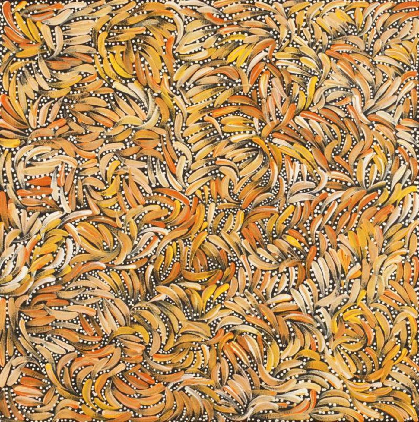 In Warlpiri paintings, traditional iconography is used to represent the Jukurrpa and other elements. Curved lines are used to represent the long, skinny edible portion of the ‘purrpalanji’ (skinny bush banana).