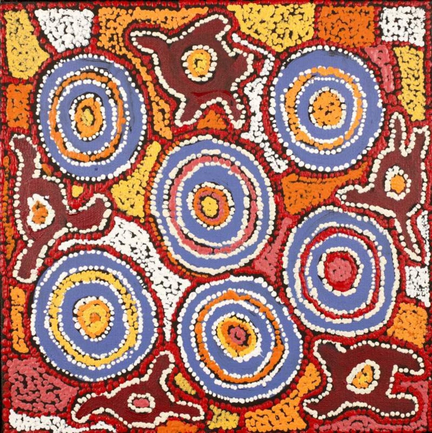 The site for this Dreaming is Yumari, a collection of rocks west of Kintore in the Gibson Desert. Yumari is the site of a forbidden love union between a Japaljarri man and a Nangala woman. This Dreaming was passed down to the artist by a Pintupi man. In contemporary Warlpiri paintings traditional iconography is used to represent the Jukurrpa, associated sites and other elements. In this work concentric circles are often used to represent ‘warnirri’ (rock holes).