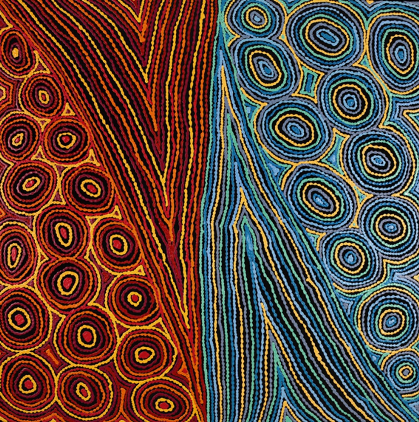 The subject of this work is Lappi Lappi, a rock hole near Lake Hazlett, about 90 km northwest of Lake Mackay in Western Australia. The country belongs to Nampijinpa/Jampijinpa and Nangala/Jangala skin groups. Located in a sheltered basin, the rock hole at Lappi Lappi is a permanent source of water, and is surrounded by country rich in bush tucker. In the time of the Jukurrpa (Dreamtime) many mothers with young children would gather there because it was a safe place to stay. The rock hole at Lappi Lappi is home to a ‘warnayarra’, a rainbow serpent that travels underground between various rock holes. One day, women were gathered at the rock hole with their children, singing and dancing. When the ‘warnayarra’ heard the sound of voices, it travelled silently towards them, under the water. When it reached the edge of the rock hole, it rose out of the water and ate them all.