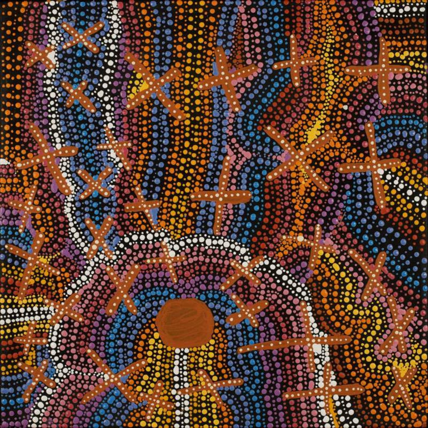 The Jukurrpa site shown in this painting for Ngatijirri (budgerigar [Melopsittacus undulates]) is at Yangarnmpi, south of Yuendumu. ‘Ngatijirri’ are small, bright green birds native to central Australia which are common around the Yuendumu area, especially after the summer rains. Men would hunt for ‘ngatijirri’ nests, robbing them of eggs and juvenile birds, which are both considered delicacies. The men would also go out hunting for adult, flying ‘ngatijirri’, which they would kill by swinging branches, killing sticks or ‘karli’ (boomerangs) to hit the birds in flight. The ‘ngatijirri’ travelled to Yangarnmpi from Patirlirri, near Willowra to the east of Yuendumu and travelled further on to Marngangi, north/west of Mount Dennison and west of Yuendumu. Each time the flock of ancestral ‘ngatijirri’ lands, they perform ceremonies, singing and dancing as they fly and roost in the trees. The sites of these ceremonies are depicted in this painting as concentric circles, while cross-like shapes depict the footprints of the birds on the ground and give an indication of the large flocks of ‘ngatijirri’ that can be found near Yangarnmpi and other sites close to Yuendumu. After good rains ‘ngatijirri’ can successfully breed several times, resulting in an explosion of the population in a short time. Custodians for the Ngatijirri Jukurrpa are Napaljarri/Nungarrayi women and Japaljarri/Jungarrayi men.