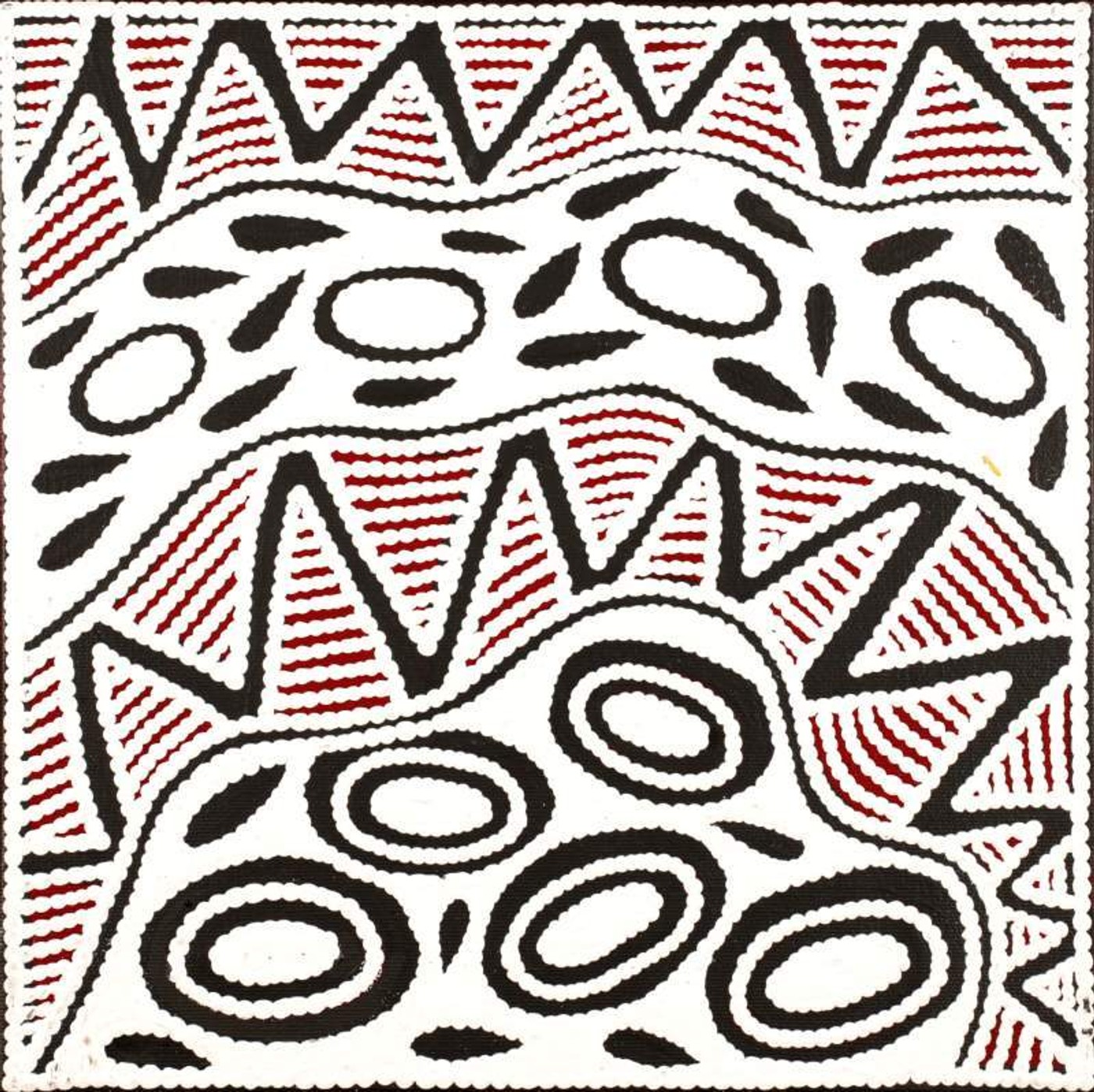 Pikilyi is a large and important waterhole and natural spring near Mount Doreen station. Pikilyi Jukurrpa (Vaughan Springs Dreaming) tells of the home of two rainbow serpents, ancestral heroes who lived together as man and wife. The woman ‘rainbow serpent’ was of the Napanangka skin group, the man was a Japangardi. This was a taboo relationship contrary to Warlpiri religious law. Women of the Napanangka and Napangardi subsection sat by the two serpents, picking lice off them. For this service, the two serpents allowed the women to take water from the springs at Pikilyi. This was because the serpents were the ‘kirda’, or ceremonial owners, for that country. The spirits of these two rainbow serpents are still at Pikilyi today. This Dreamings belongs to the women and men of the Japanangka/Napanangka and Japangardi/Napangardi skin groups.
