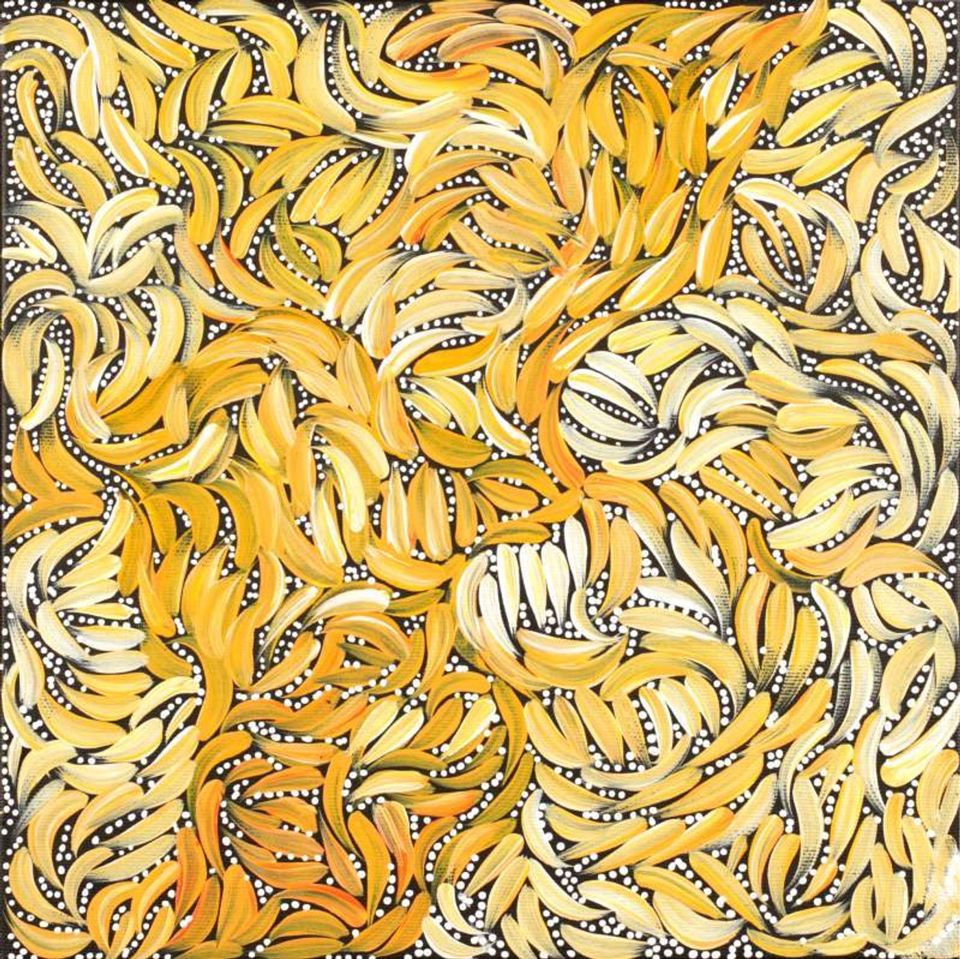 This ‘purrpalanji Jukurrpa’ (skinny bush banana Dreaming) comes from Pikilyi (Vaughan Springs), a large waterhole and natural spring to the west of Yuendumu, close to Mount Doreen. Napangardi/Napanangka women and Japangardi/Japanangka men are the ‘kirda’ (owners) of the skinny bush banana Dreaming at Pikilyi. Nangala women and Jangala men are the ‘kurdungurlu’ (custodians) of this Dreaming.