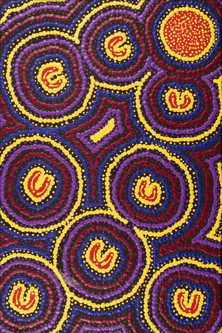 The subject of this work is Lappi Lappi, a rock hole near Lake Hazlett, about 90 km northwest of Lake Mackay in Western Australia. The country belongs to Nampijinpa/Jampijinpa and Nangala/Jangala skin groups. Located in a sheltered basin, the rock hole at Lappi Lappi is a permanent source of water, and is surrounded by country rich in bush tucker. In the time of the Jukurrpa (Dreamtime) many mothers with young children would gather there because it was a safe place to stay. The rock hole at Lappi Lappi is home to a ‘warnayarra’, a rainbow serpent that travels underground between various rock holes. One day, women were gathered at the rock hole with their children, singing and dancing. When the ‘warnayarra’ heard the sound of voices, it travelled silently towards them, under the water. When it reached the edge of the rock hole, it rose out of the water and ate them all.