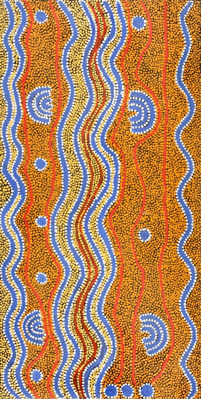 In contemporary Warlpiri paintings, traditional iconography can be used to represent the Jukurrpa, particular sites, and other elements. Paintings of the ‘Pirlarla Jukurrpa’ often include designs that are painted onto women’s bodies during their Yawulyu ceremonies. Long sinuous lines represent the ‘pirlarla’ (bush beans), while round circles represent the ‘wakirlpirri’ (dogwood trees) that they grow on. Shorter curved lines can represent small ‘pirlarla.’