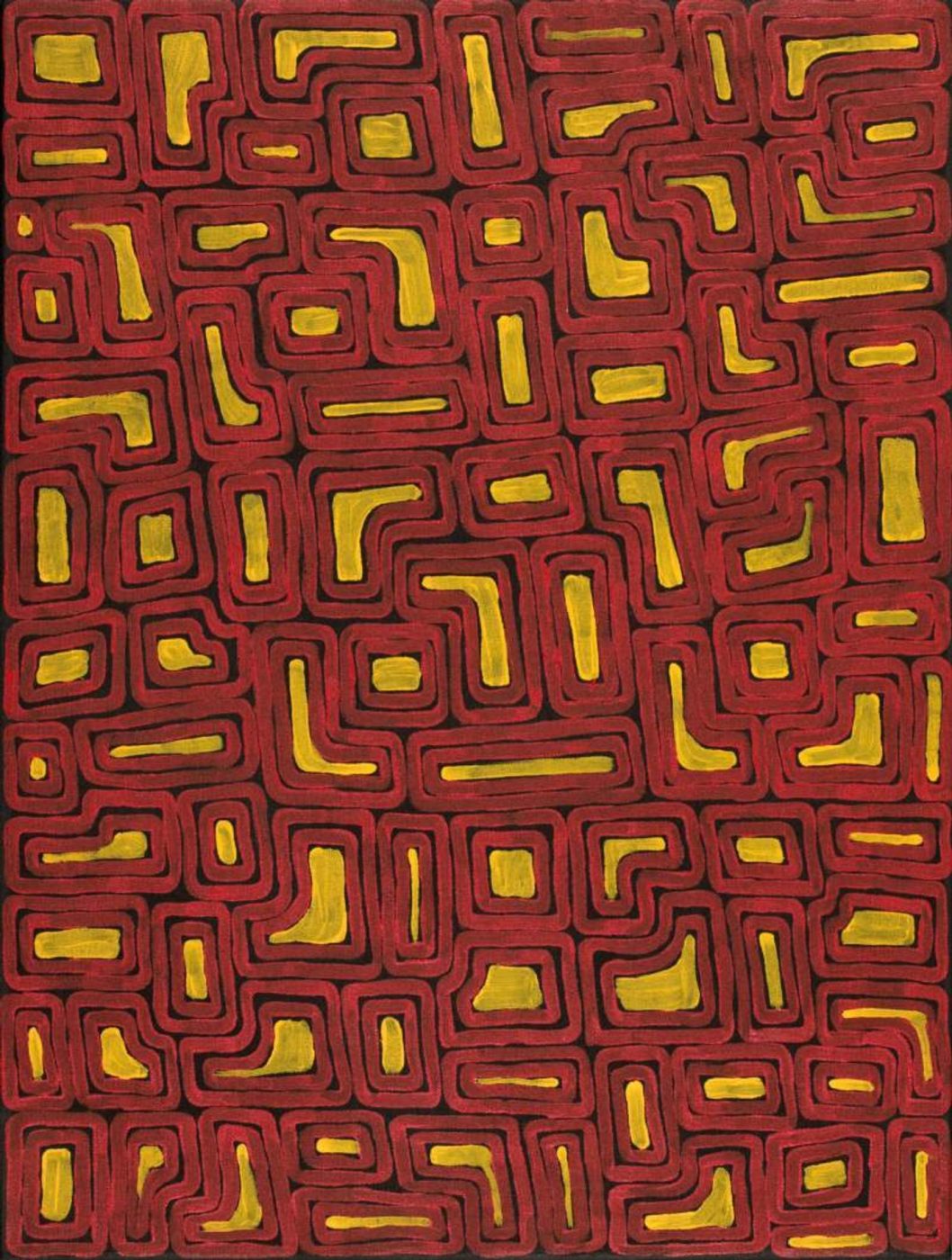 This painting depicts a portion of the Tingari cycle, a very important collection of Dreaming narratives from the Western Desert region. The country that this painting depicts is located far to the west of Yuendumu, and spans a vast area of land across the Gibson and Great Sandy Deserts in Western Australia. Aboriginal groups that paint the Tingari cycle include the Pintupi, Kukatja, Ngarti, and Walmajarri peoples, among others.