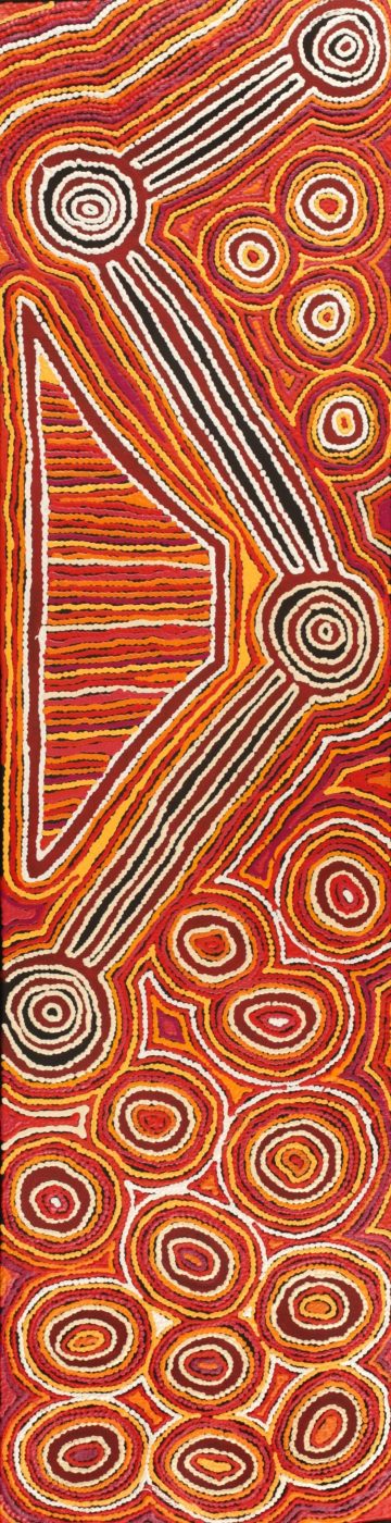 The subject of this work is Lappi Lappi, a rock hole near Lake Hazlett, about 90 km northwest of Lake Mackay in Western Australia. The country belongs to Nampijinpa/Jampijinpa and Nangala/Jangala skin groups. Located in a sheltered basin, the rock hole at Lappi Lappi is a permanent source of water, and is surrounded by country rich in bush tucker. In the time of the Jukurrpa (Dreamtime) many mothers with young children would gather there because it was a safe place to stay. The rock hole at Lappi Lappi is home to a ‘warnayarra’, a rainbow serpent that travels underground between various rock holes. One day, women were gathered at the rock hole with their children, singing and dancing. When the ‘warnayarra’ heard the sound of voices, it travelled silently towards them, under the water. When it reached the edge of the rock hole, it rose out of the water and ate them all.