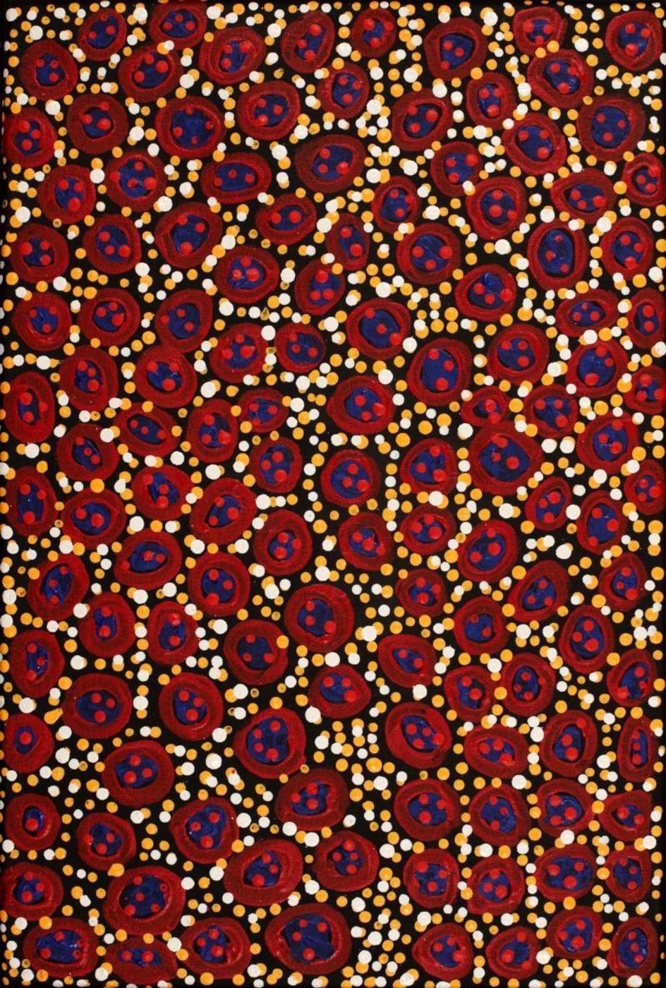 The site depicted in this painting is Puyurru, west of Yuendumu. In the usually dry creek beds are ‘mulju’ (soakages), or naturally occurring wells. The ‘kirda’ (owners) for this site are Nangala/Nampijinpa women and Jangala/Jampijinpa men. Two Jangala men, rainmakers, sang the rain, unleashing a giant storm. The storm travelled across the country from the east to the west, initially travelling with a ‘pamapardu Jukurrpa’ (termite Dreaming) from Warntungurru to Warlura, a waterhole 8 miles east of Yuendumu. At Warlura, a gecko called Yumariyumari blew the storm on to Lapurrukurra and Wilpiri. Bolts of lightning shot out at Wirnpa (also called Mardinymardinypa) and at Kanaralji. At this point the Dreaming track also includes the ‘kurdukurdu mangkurdu Jukurrpa’ (children of the clouds Dreaming). The water Dreaming built hills at Ngamangama using baby clouds and also stuck long pointy clouds into the ground at Jukajuka, where they can still be seen today as rock formations.
