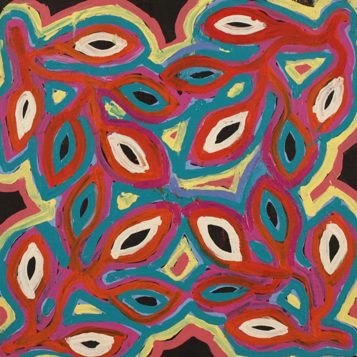 This ‘purrpalanji Jukurrpa’ (skinny bush banana Dreaming) comes from Pikilyi (Vaughan Springs), a large waterhole and natural spring to the west of Yuendumu, close to Mount Doreen. Napangardi/Napanangka women and Japangardi/Japanangka men are the ‘kirda’ (owners) of the skinny bush banana Dreaming at Pikilyi. Nangala women and Jangala men are the ‘kurdungurlu’ (custodians) of this Dreaming.