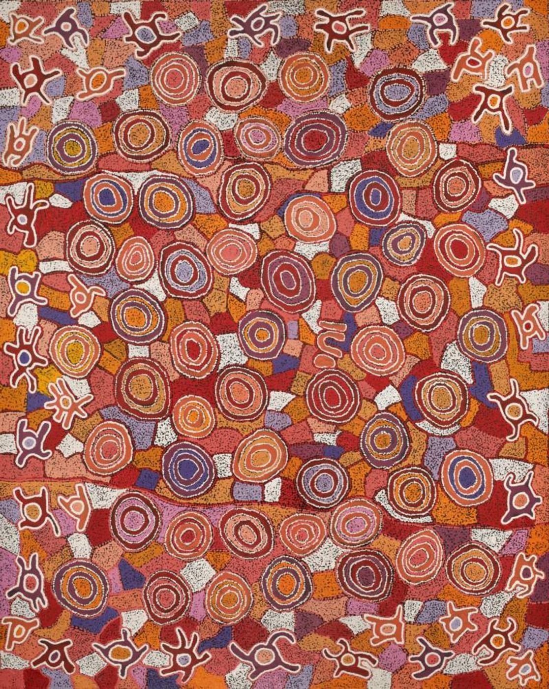 The site for this Dreaming is Yumari, a collection of rocks west of Kintore in the Gibson Desert. Yumari is the site of a forbidden love union between a Japaljarri man and a Nangala woman. This Dreaming was passed down to the artist by a Pintupi man. In contemporary Warlpiri paintings traditional iconography is used to represent the Jukurrpa, associated sites and other elements. In this work concentric circles are often used to represent ‘warnirri’ (rock holes).