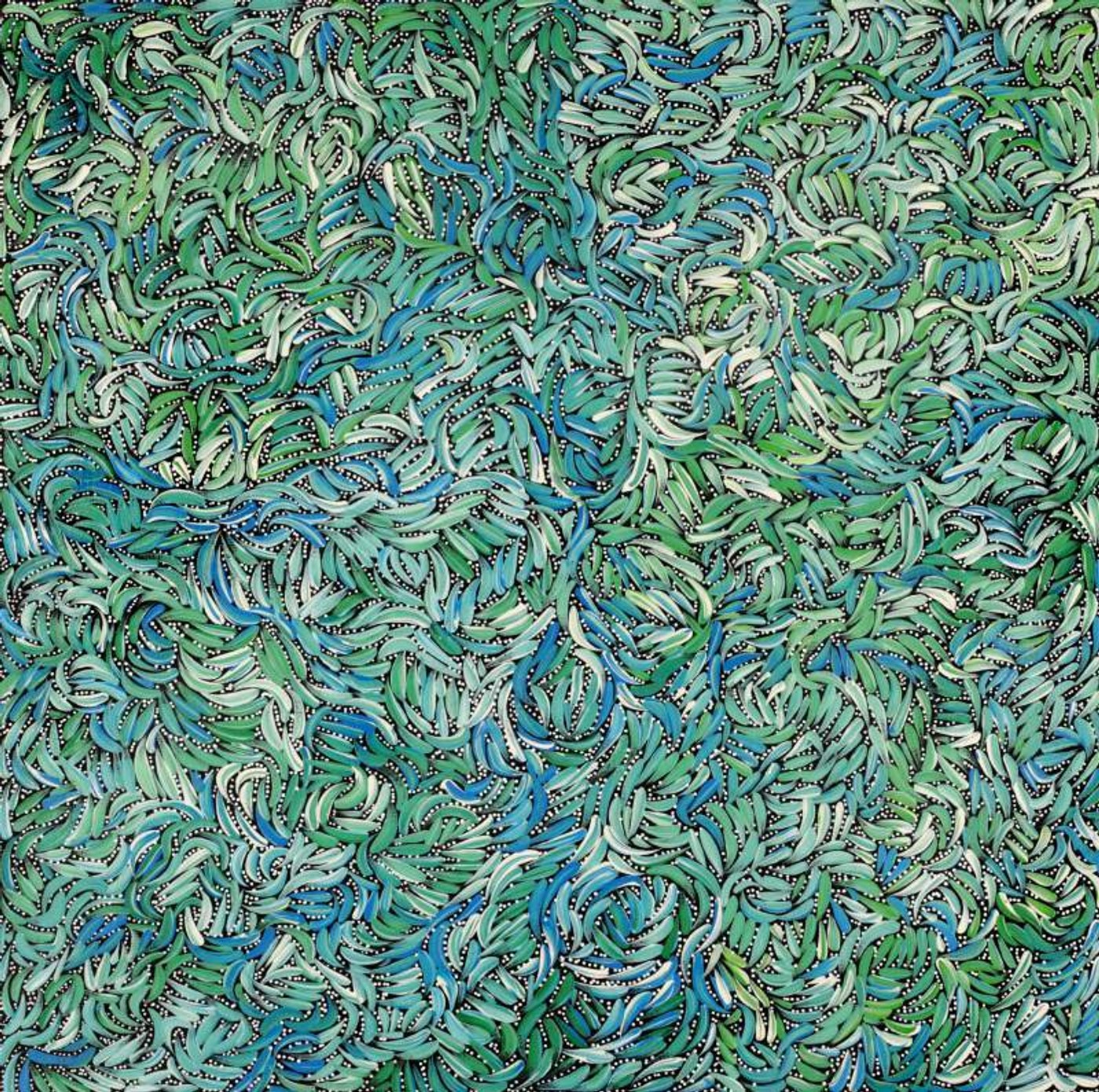 This ‘purrpalanji Jukurrpa’ (skinny bush banana Dreaming) comes from Pikilyi (Vaughan Springs), a large waterhole and natural spring to the west of Yuendumu, close to Mount Doreen. Napangardi/Napanangka women and Japangardi/Japanangka men are the ‘kirda’ (owners) of the skinny bush banana Dreaming at Pikilyi. Nangala women and Jangala men are the ‘kurdungurlu’ (custodians) of this Dreaming.