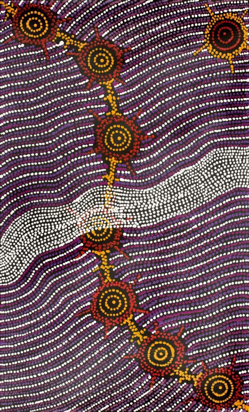 Yanjirlpirri Jukurrpa (Star Dreaming) tells of the journey of Japaljarri and Jungarrayi men who travelled from Kurlurngalinypa (near Lajamanu) to Yanjirlypirri (west of Yuendumu) and then on to Lake Mackay on the West Australian border. Along the way they performed ‘kurdiji’ (initiation ceremonies) for young men. Women also danced for the ‘kurdiji’. The site depicted in this canvas is Yanjirlypiri (star) where there is a low hill and a water soakage. The importance of this place cannot be overemphasized as young boys are brought here to be initiated from as far as Pitjanjatjara country to the south and Lajamanu to the north.
