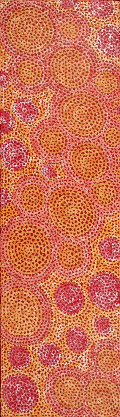 This painting depicts the Pamapardu Jukurrpa (Flying Ant Dreaming) from Warntungurru, west of Yuendumu. ‘Pamapardu’ is the Warlpiri name for the flying ants or termites that build the large anthills found throughout Warlpiri country. This country belongs to Nakamarra/Napurrurla women and Jakamarra/Jupurrurla men. ‘Pamapardu’ are flying ants. They build earth mounds (‘mingkirri’) that are common in the Tanami area. When heavy rains come in summer the ‘mingkirri’ get flooded out, so the ‘pamapardu’ grow wings and fly off to make new homes, following their queens to dry mounds or to build a new. When they have found their new home they drop their wings. In this stage they can be collected, lightly cooked in coals and eaten. As they fall to the ground women collect them to eat because they are nice and sweet. In contemporary Warlpiri paintings traditional iconography is used to represent the Jukurrpa, particular sites and other elements. When this Jukurrpa story is painted concentric circles are used to represent the ‘mingkirri’ and the rockholes involved in the story, including the central one at Wapurtali (Mt Singleton). Dashes are often depicted around the circles to represent the ‘pamapardu’.