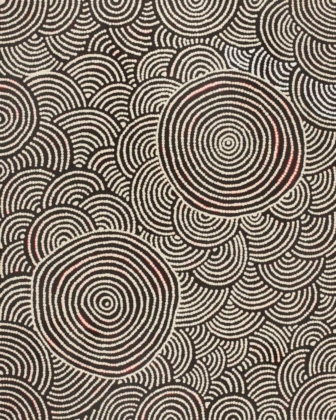 The artist has painted country where they grew up in Warburton, just south of the Gibson Desert. Here they spent time with family who lived at a very small outstation with a couple of houses out in the bush. Near to the outstation is a rockhole where the artist learned how to find bush tucker like honey ants and turkey.