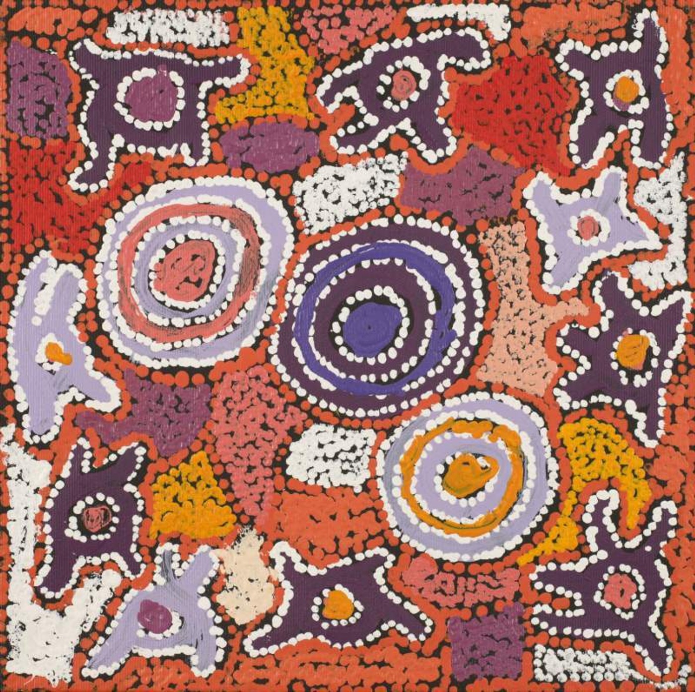 The site for this Dreaming is Yumari, a collection of rocks west of Kintore in the Gibson Desert. Yumari is the site of a forbidden love union between a Japaljarri man and a Nangala woman. This Dreaming was passed down to the artist by a Pintupi man. In contemporary Warlpiri paintings traditional iconography is used to represent the Jukurrpa, associated sites and other elements. In this work concentric circles are often used to represent ‘warnirri’ (rock holes).