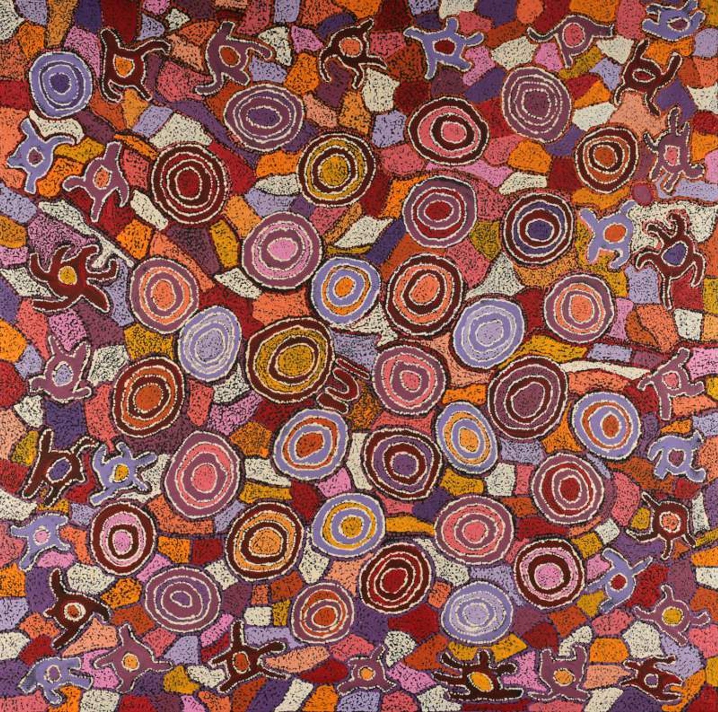 The site for this Dreaming is Yumari, a collection of rocks west of Kintore in the Gibson Desert. Yumari is the site of a forbidden love union between a Japaljarri man and a Nangala woman. This Dreaming was passed down to the artist by a Pintupi man. In contemporary Warlpiri paintings traditional iconography is used to represent the Jukurrpa, associated sites and other elements. In this work concentric circles are often used to represent ‘warnirri’ (rock holes).