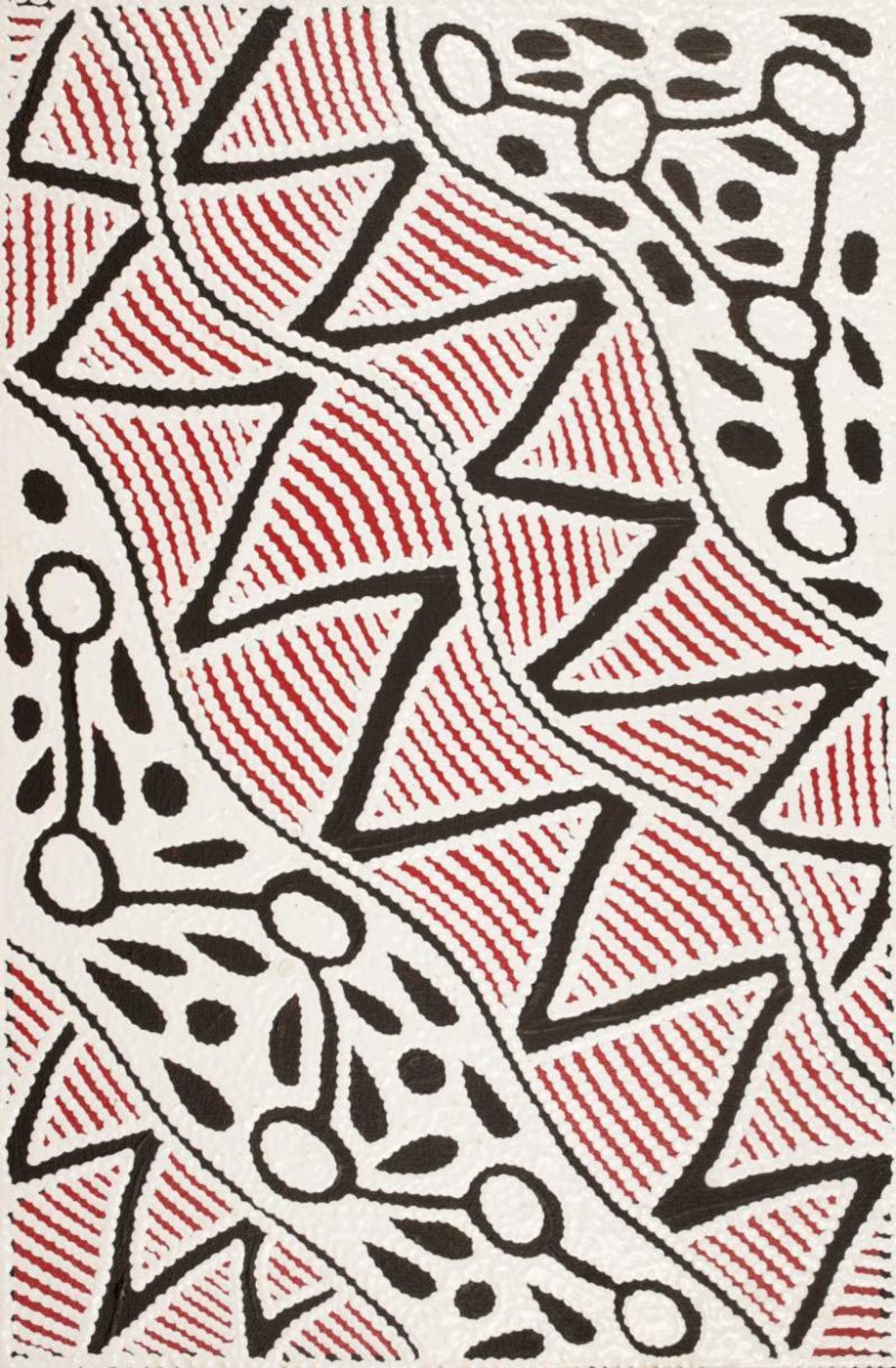Pikilyi is a large and important waterhole and natural spring near Mount Doreen station. Pikilyi Jukurrpa (Vaughan Springs Dreaming) tells of the home of two rainbow serpents, ancestral heroes who lived together as man and wife. The woman ‘rainbow serpent’ was of the Napanangka skin group, the man was a Japangardi. This was a taboo relationship contrary to Warlpiri religious law. Women of the Napanangka and Napangardi subsection sat by the two serpents, picking lice off them. For this service, the two serpents allowed the women to take water from the springs at Pikilyi. This was because the serpents were the ‘kirda’, or ceremonial owners, for that country. The spirits of these two rainbow serpents are still at Pikilyi today. This Dreamings belongs to the women and men of the Japanangka/Napanangka and Japangardi/Napangardi skin groups.