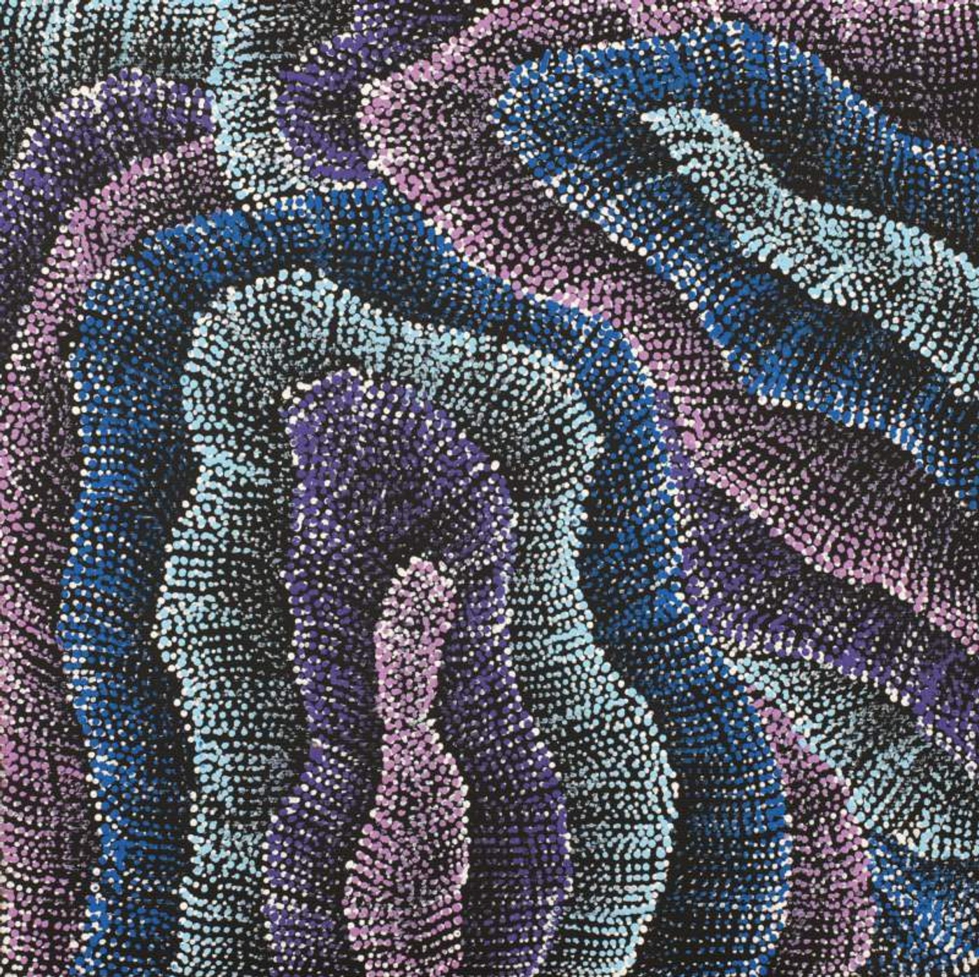 The Wanakiji Jukurrpa (bush tomato [Solanum chippendalei] Dreaming) travels through Yaturlu (near Mount Theo, north of Yuendumu). “Wanakiji” grows in open spinifex country and is a small, prickly plant with purple flowers that bears green fleshy fruit with many small black seeds. After collecting the fruit the seeds are removed with a small wooden spoon called ‘kajalarra’. The fruit then can be eaten raw or threaded onto skewers called ‘turlturrpa’ and then cooked over a fire. ‘Wanakiji’ can also be skewered and left to dry. When they are prepared in this way it is called ‘turlturrpa’ and the fruit can be kept for a long time. In contemporary Warlpiri paintings traditional iconography is used to represent the Jukurrpa, particular sites and other elements. The Wanakiji Jukurrpa belongs to Napanangka/Napangardi women and Japanangka/Japangardi men.