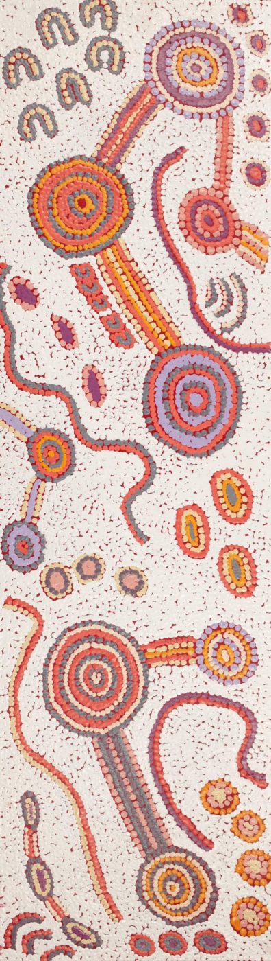 This painting depicts a ‘yurrampi Jukurrpa’ (honey ant Dreaming). This Jukurrpa has special significance for Warlpiri people living in Yuendumu because it passes right through the Yuendumu community. Yuendumu is therefore also called ‘Yurrampi’ (honey ant) for this reason. The ‘kirda’ (owners) of this Jukurrpa are Japangardi/Japanangka men and Napangardi/Napanangka women.