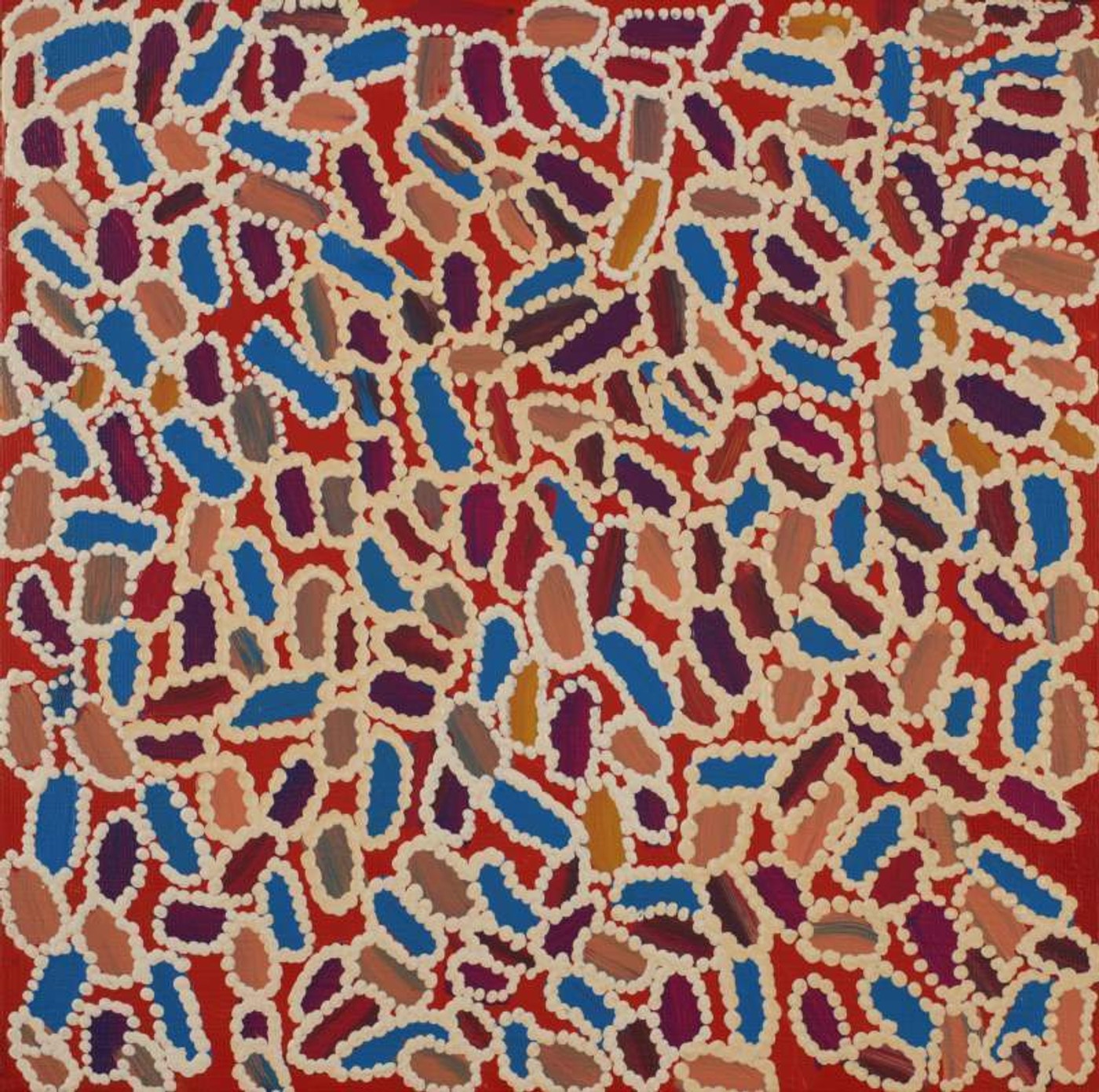 This painting depicts the Pamapardu Jukurrpa (Flying Ant Dreaming) from Warntungurru, west of Yuendumu. ‘Pamapardu’ is the Warlpiri name for the flying ants or termites that build the large anthills found throughout Warlpiri country. This country belongs to Nakamarra/Napurrurla women and Jakamarra/Jupurrurla men. ‘Pamapardu’ are flying ants. They build earth mounds (‘mingkirri’) that are common in the Tanami area. When heavy rains come in summer the ‘mingkirri’ get flooded out, so the ‘pamapardu’ grow wings and fly off to make new homes, following their queens to dry mounds or to build a new. When they have found their new home they drop their wings. In this stage they can be collected, lightly cooked in coals and eaten. As they fall to the ground women collect them to eat because they are nice and sweet. In contemporary Warlpiri paintings traditional iconography is used to represent the Jukurrpa, particular sites and other elements. When this Jukurrpa story is painted concentric circles are used to represent the ‘mingkirri’ and the rockholes involved in the story, including the central one at Wapurtali (Mt Singleton). Dashes are often depicted around the circles to represent the ‘pamapardu’.