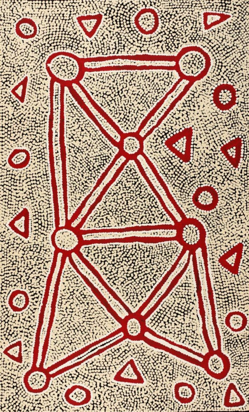 In contemporary Warlpiri paintings, traditional iconography is used to represent the ‘Jukurrpa’ (Dreaming), associated sites, and other elements. Short dashes are often used to represent ‘mangkurdu’ (cumulus & stratocumulus clouds), and longer, flowing lines represent ‘ngawarra’ (flood waters). Small circles are used to depict ‘mulju’ (soakages) and river beds.