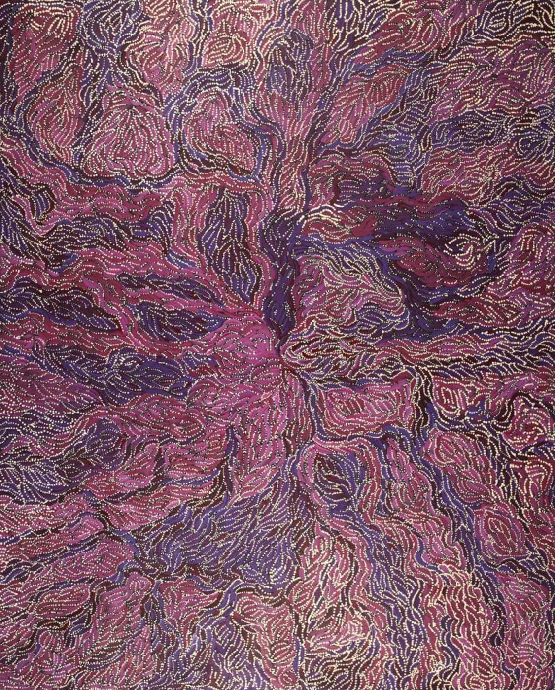This ‘purrpalanji Jukurrpa’ (skinny bush banana Dreaming) comes from Pikilyi (Vaughan Springs), a large waterhole and natural spring to the west of Yuendumu, close to Mount Doreen. Napangardi/Napanangka women and Japangardi/Japanangka men are the ‘kirda’ (owners) of the skinny bush banana Dreaming at Pikilyi. Nangala women and Jangala men are the ‘kurdungurlu’ (custodians) of this Dreaming.