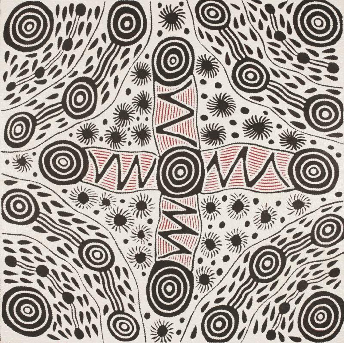 Pikilyi is a large and important waterhole and natural spring near Mount Doreen station. Pikilyi Jukurrpa (Vaughan Springs Dreaming) tells of the home of two rainbow serpents, ancestral heroes who lived together as man and wife. The woman ‘rainbow serpent’ was of the Napanangka skin group, the man was a Japangardi. This was a taboo relationship contrary to Warlpiri religious law. Women of the Napanangka and Napangardi subsection sat by the two serpents, picking lice off them. For this service, the two serpents allowed the women to take water from the springs at Pikilyi. This was because the serpents were the ‘kirda’, or ceremonial owners, for that country. The spirits of these two rainbow serpents are still at Pikilyi today. This Dreamings belongs to the women and men of the Japanangka/Napanangka and Japangardi/Napangardi skin groups.
