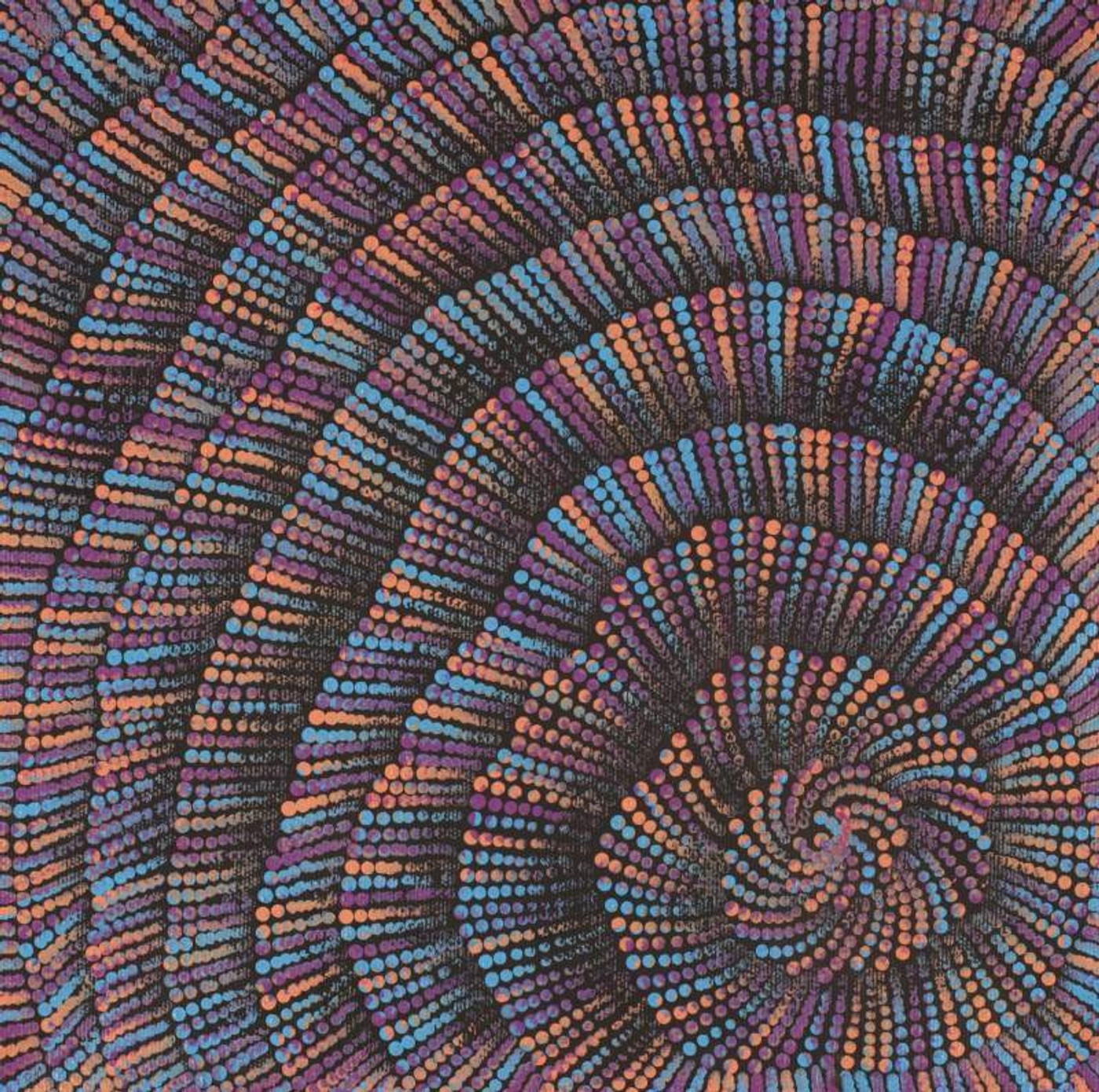 This painting depicts the Pamapardu Jukurrpa (Flying Ant Dreaming) from Warntungurru, west of Yuendumu. ‘Pamapardu’ is the Warlpiri name for the flying ants or termites that build the large anthills found throughout Warlpiri country. This country belongs to Nakamarra/Napurrurla women and Jakamarra/Jupurrurla men. ‘Pamapardu’ are flying ants. They build earth mounds (‘mingkirri’) that are common in the Tanami area. When heavy rains come in summer the ‘mingkirri’ get flooded out, so the ‘pamapardu’ grow wings and fly off to make new homes, following their queens to dry mounds or to build a new. When they have found their new home they drop their wings. In this stage they can be collected, lightly cooked in coals and eaten. As they fall to the ground women collect them to eat because they are nice and sweet. In contemporary Warlpiri paintings traditional iconography is used to represent the Jukurrpa, particular sites and other elements. When this Jukurrpa story is painted concentric circles are used to represent the ‘mingkirri’ and the rockholes involved in the story, including the central one at Wapurtali (Mt Singleton). Dashes are often depicted around the circles to represent the ‘pamapardu’.