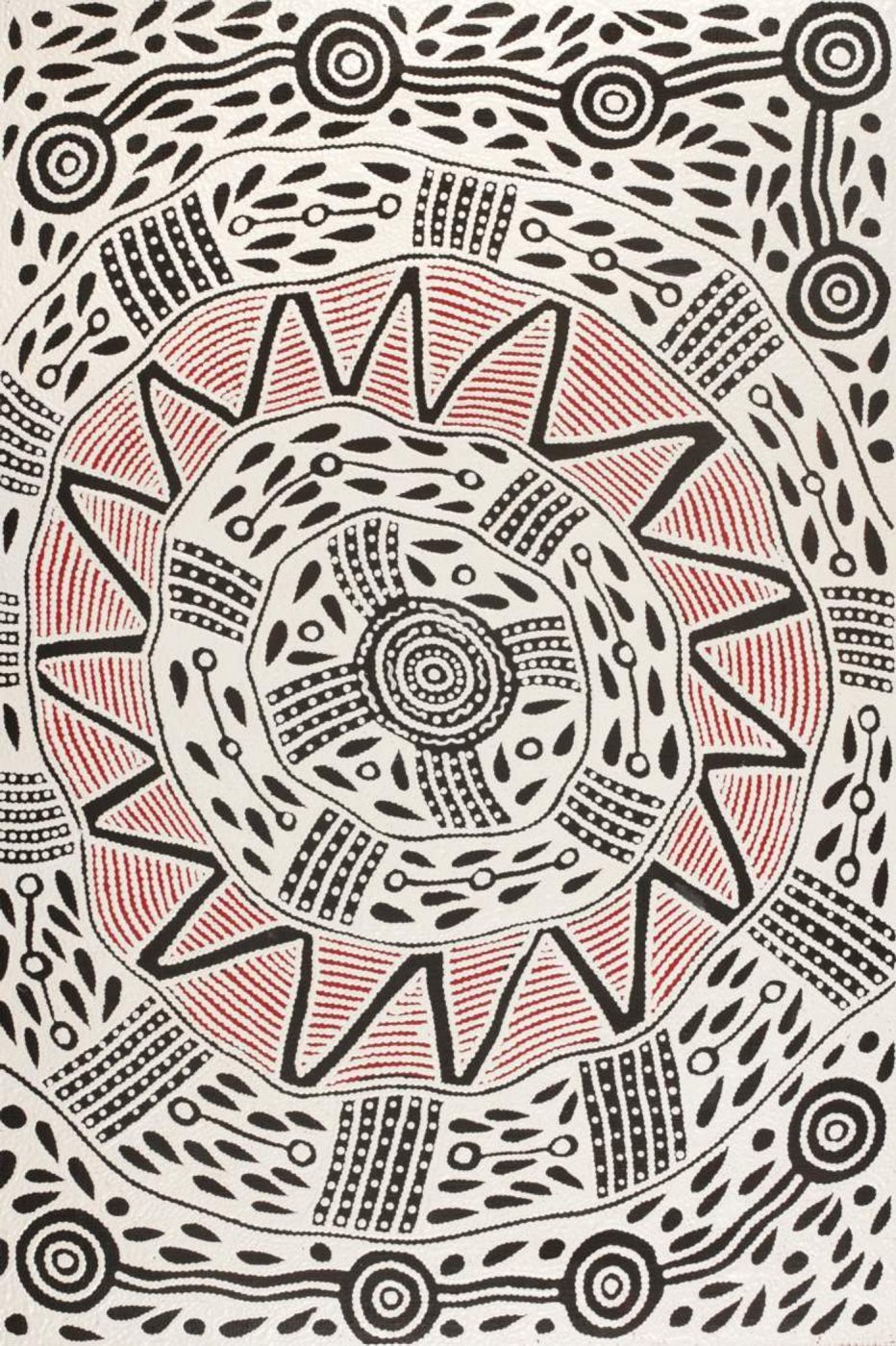 Pikilyi is a large and important waterhole and natural spring near Mount Doreen station. Pikilyi Jukurrpa (Vaughan Springs Dreaming) tells of the home of two rainbow serpents, ancestral heroes who lived together as man and wife. The woman ‘rainbow serpent’ was of the Napanangka skin group, the man was a Japangardi. This was a taboo relationship contrary to Warlpiri religious law. Women of the Napanangka and Napangardi subsection sat by the two serpents, picking lice off them. For this service, the two serpents allowed the women to take water from the springs at Pikilyi. This was because the serpents were the ‘kirda’, or ceremonial owners, for that country. The spirits of these two rainbow serpents are still at Pikilyi today. This Dreamings belongs to the women and men of the Japanangka/Napanangka and Japangardi/Napangardi skin groups.