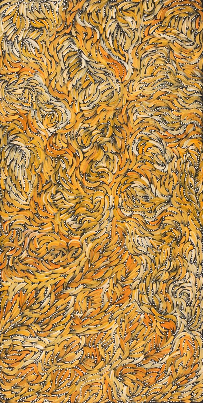 This ‘purrpalanji Jukurrpa’ (skinny bush banana Dreaming) comes from Pikilyi (Vaughan Springs), a large waterhole and natural spring to the west of Yuendumu, close to Mount Doreen. Napangardi/Napanangka women and Japangardi/Japanangka men are the ‘kirda’ (owners) of the skinny bush banana Dreaming at Pikilyi. Nangala women and Jangala men are the ‘kurdungurlu’ (custodians) of this Dreaming.