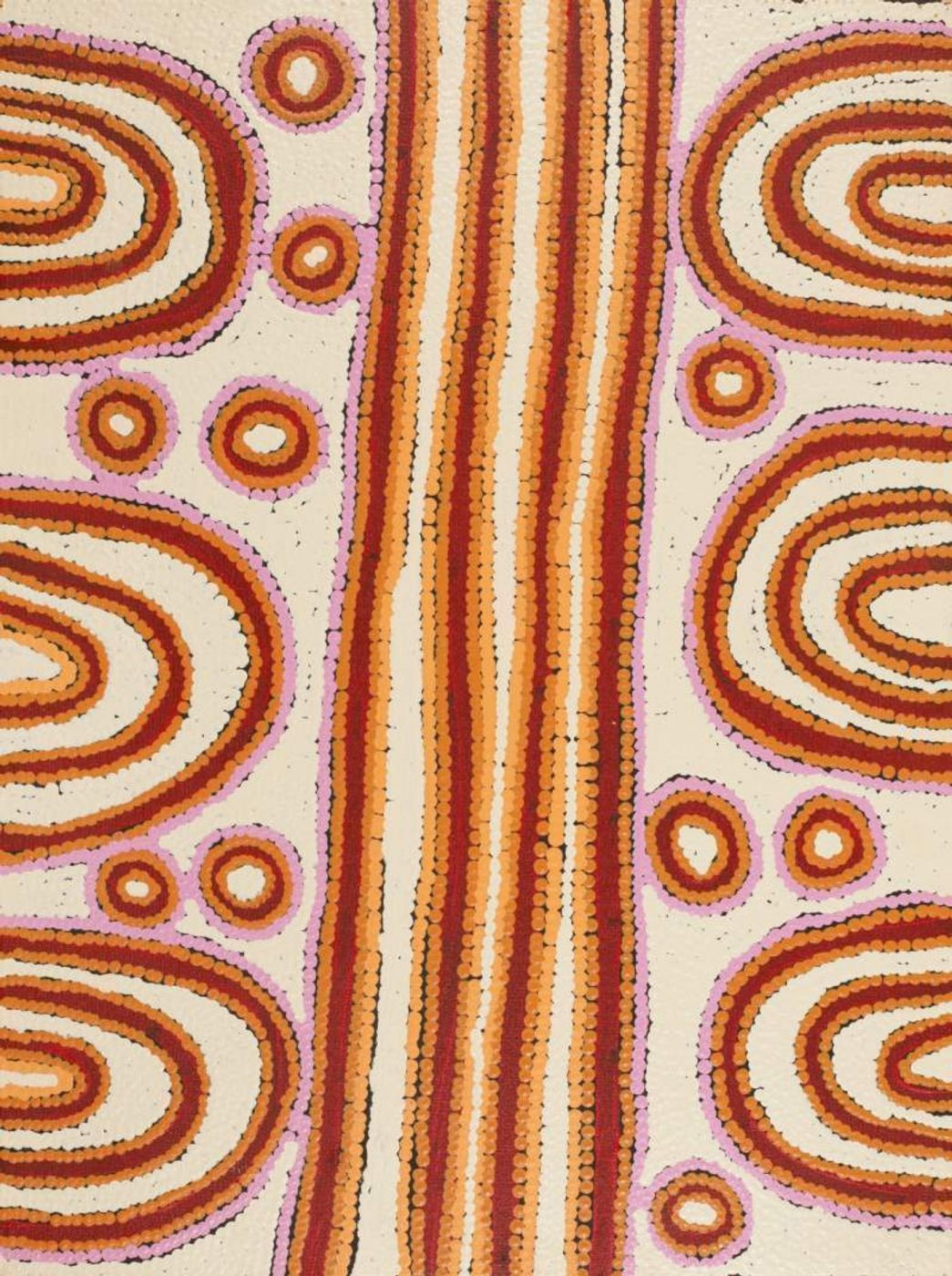 The place depicted in this painting, Ngama, is located south of Yuendumu in the Northern Territory. This Dreaming belongs to Nakamarra/Napurrurla women and Jakamarra/Jupurrurla men. This story describes the journey of Yarripiri, an ancestral ‘warna’ (snake). He travelled from Wirnparrku near Mt. Liebig to Yimparlu, and continued its way through the territories of Ngapanangka-jarra, Warlajirryi, Kurnmundu, Yinyirrinyi on to Ngama. Later Yarripiri travelled further north via Mijirlparnta (Mission Creek) and right through to the top end of Australia.Yarripiri was very sad as his family had left him behind at Wirnparrku. He was blind and crippled but he was determined to follow and search them out. He had to be carried. This was the job undertaken by the ‘kurdungurlu’ (ceremonial police) of the Dreaming: the Nangala/Nampijinpa women and Jangala/Jampijinpa men. Where Yarripiri’s tail slumped and touched the ground creeks were formed, such as Mijirlparnta, west of Yuendumu. Yarripiri tracks and paths are often represented by arc shapes or curved lines depicted across the canvas.